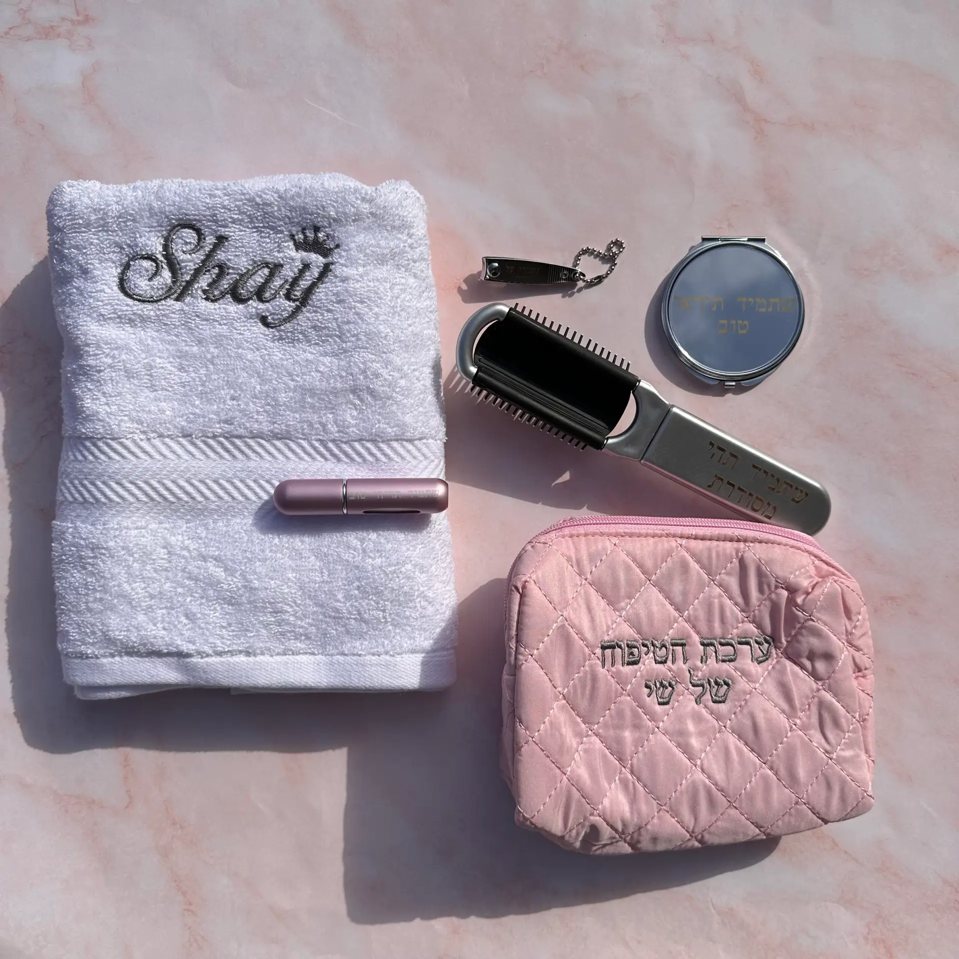 מארז לטיפוח לחיילת, מארז מפנק הכולל: מגבת פנים, מראת כיס, מסרק מתקפל, בקבוקון לבושם וקוצץ ציפורניים וכולו בהקדשה אישית מכם!